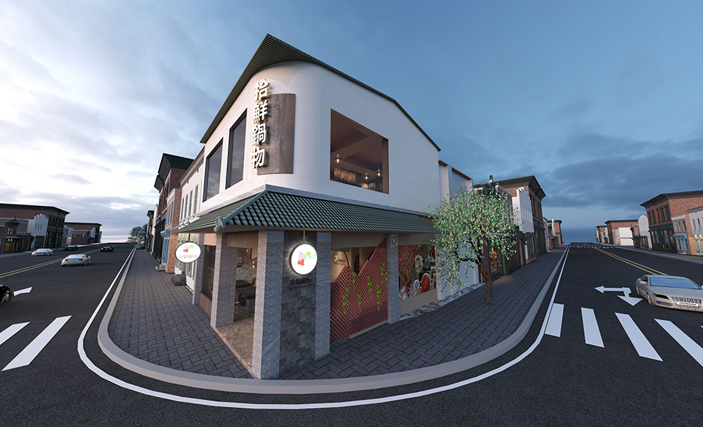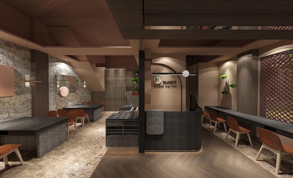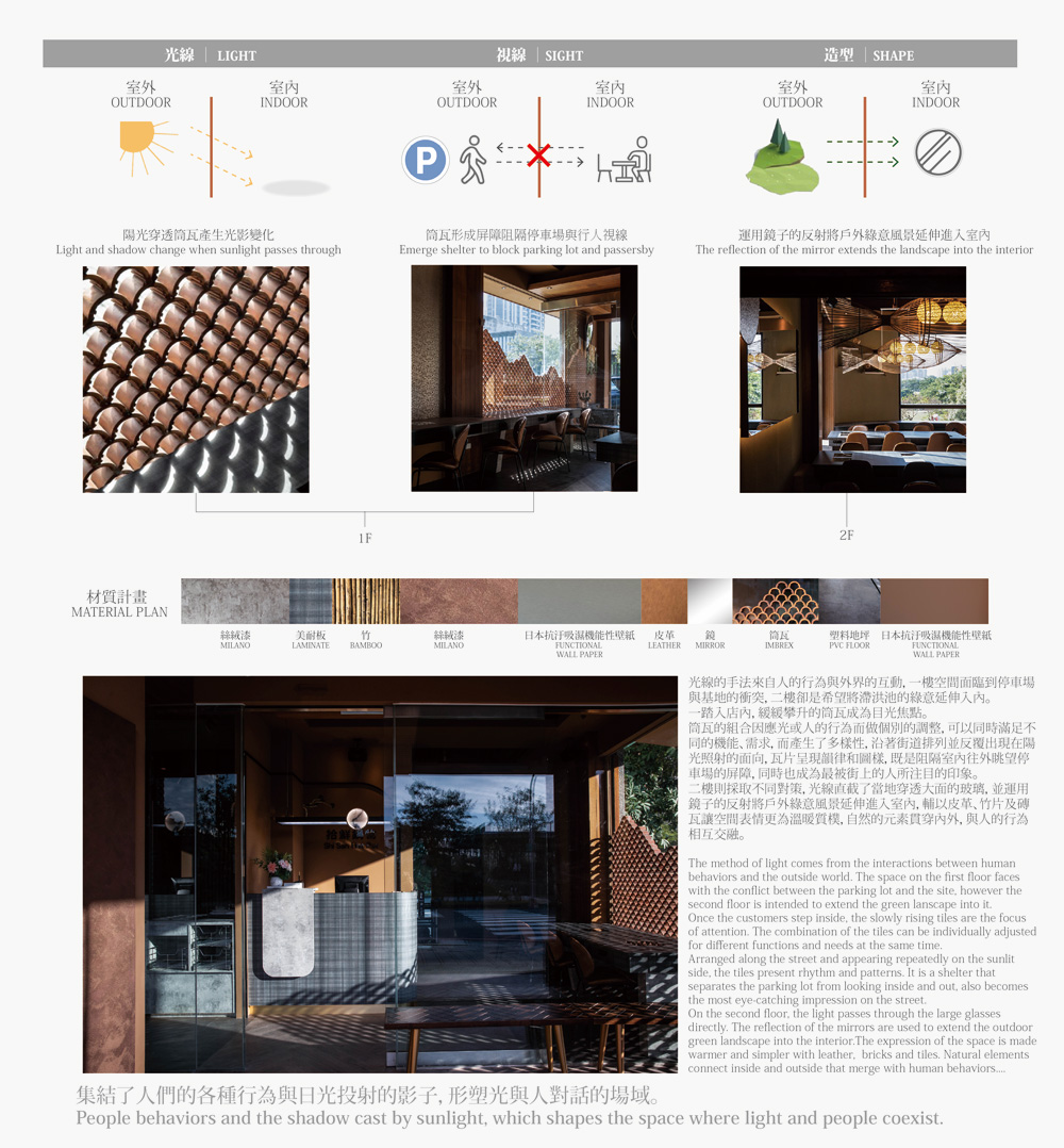 本案為座落鬧區轉角的鍋物店,提取古典元素,化用現代手法,以新舊融合的姿態煥發光彩。結合在地瓦窯品牌,將瓦之意象寓意為「鍋物送暖」,樓棟彷彿化為一口窯爐,緩緩吹送暾煦和風。新鮮食材佐以自然材質,呼應「拾得新鮮」的美好意念,轉化既定中的餐食氛圍。