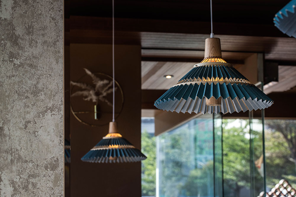 The reception counter of arc shape using of the check pattern that same as the dining tables to show the fabric veneer texture, and soften the rigid spatial perception as well. Hanging a characteristic chandelier with pine-stained feature, which gently reveals a touch of oriental charm.