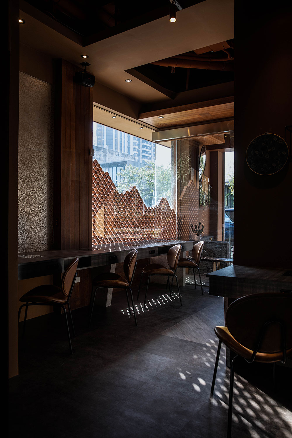 一樓單人桌區通透玻璃窗外,取其瓦窯立面,以弧形組構;一則以窯燒的手作溫度,呼應鍋物中火的元素,拓延至室內空間;二則遮蔽對向停車場的紊亂視角,亦形塑用餐隱私;當日光灑落襯出材料輪廓,堆疊出光影層次,形構出美好光景。