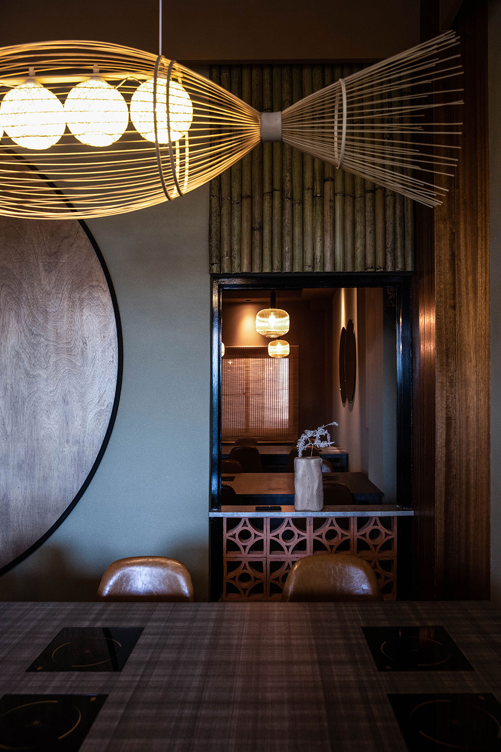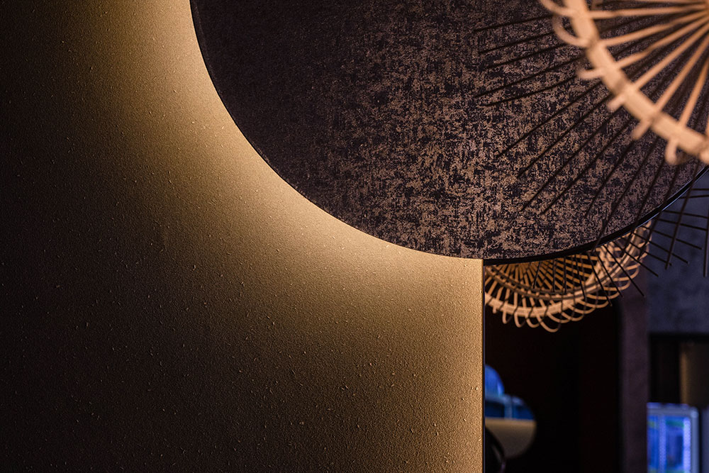 空間中運用許多圓形語彙,如鏡面、燈飾,以寓意圓融、圓滑,柔和用餐氛圍。一樓化妝間外設置一圓拱門,牆上大片鏡面投射竹筐內嵌編織的意象造型,為空間鋪展藝術氣息,盡攬餐食間的歡聲笑語。