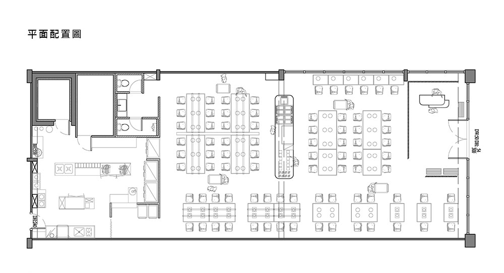 The layout divides the dining area and the kitchen space into two large blocks: the sauce island is placed in the center and the meat cabinet that services as the end view of the dining area. Differentiate the kitchen with the wall, so that the circulations are separated and delimited. After establishing the central island position, the flow extends from both sides, and the seats are arranged according to the needs that divided into single, double and multi-person, hence as well as creating the maximum usage effect of the floor. Accordingly, the design of the spatial configuration captures the psychology of customers' behavior, and at the same time meeting the servers' and the diners' needs, so as bringing about an inviting circumstance.