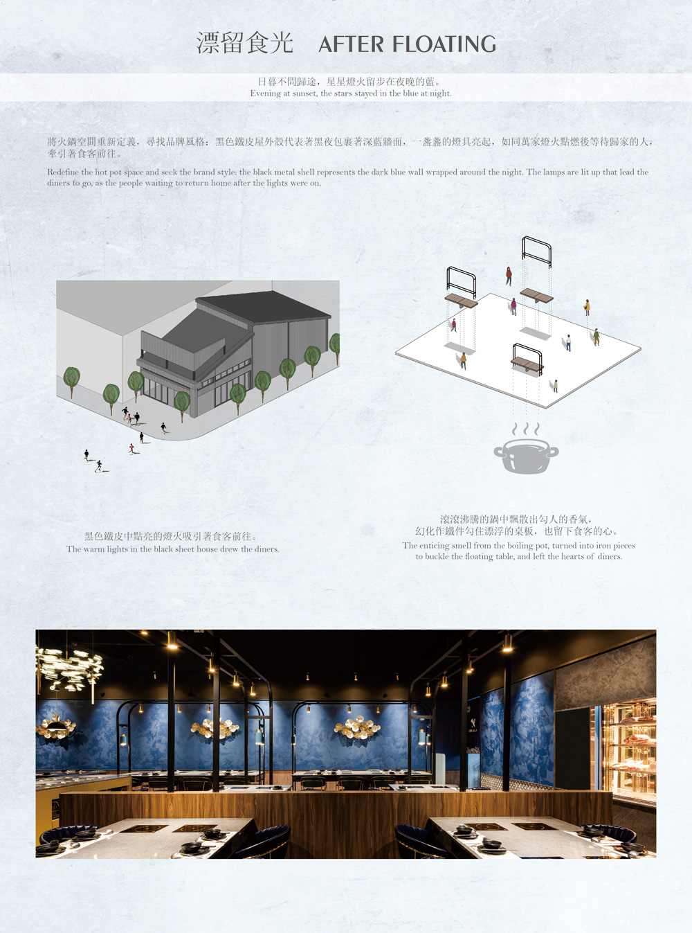 我們為鍋物店重新定義,尋找品牌風格,在餐飲空間林立的精華地帶,以鮮明意象對比,植入視覺記憶點——黑色鐵皮外殼象徵黑夜包裹,內裡貼以雲彩般流動的藍牆,一盞盞燈具亮起,如同萬家燈火點燃,牽引食客前往。