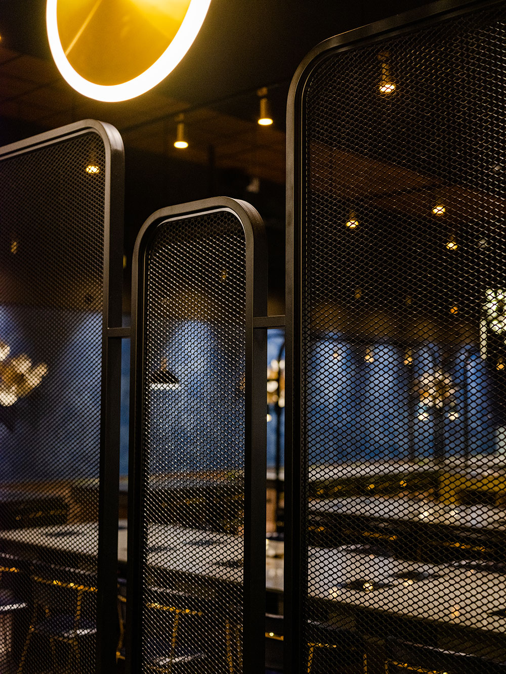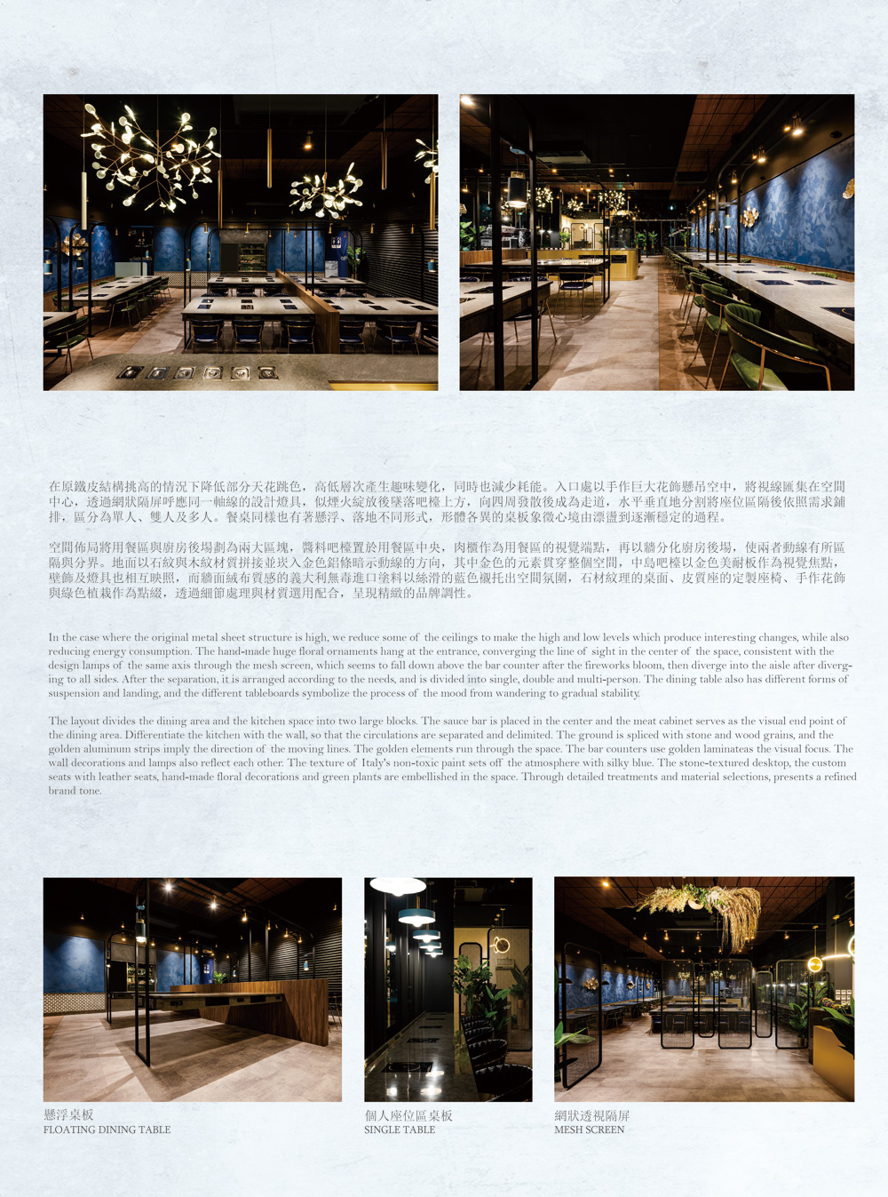 網狀隔屏交相組構,分隔人潮動線,建立用餐隱私,若隱若現拓延視覺。飲料吧及著料台當央而置,直至燈源投射下的設備肉櫃,使觸目所及產生連結開啟味蕾。