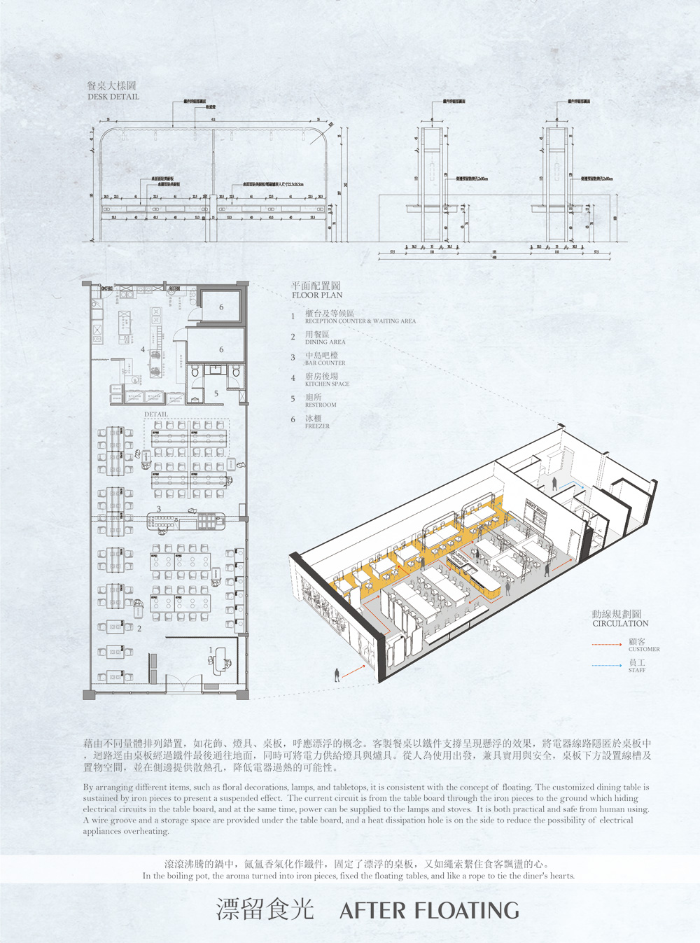 避免敞朗格局下,餐區整體過於空曠,餐桌部分採以懸浮、落地相異形式,形體各異的桌板,創造出層疊遞進的視覺效果,隱隱區分個別單元,象徵由載浮載成到逐漸穩定的心境轉變。
