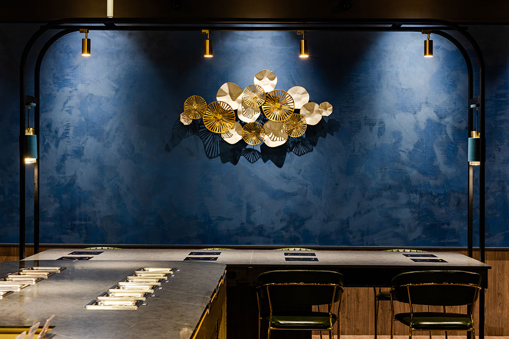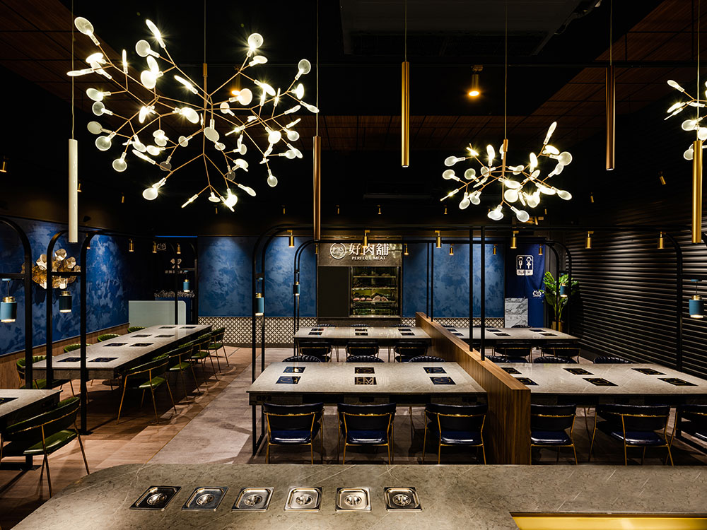 軟裝配置計畫,在予人視覺停留及記憶暫存的想法上執行,大片藍染質調,掛以煙花燦爛的燈飾,搭襯外觀鐵皮黑幕,如夜色中的煙火,流光溢彩。木紋質調地坪、石材肌理桌面,凸顯白淨肉盤;熱氣蒸騰,熹微且暖,氤氳一室。