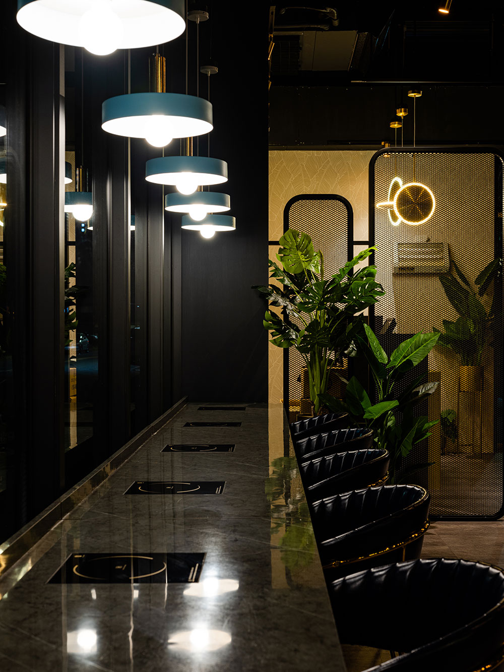 從人為使用角度出發,於桌板下方設置線槽及置物空間,並在側邊設計散熱孔,降低電器過熱的可能性,兼具安全實用機能。架高桌體結合鐵工、木工、燈具三方複雜工序,預埋迴路精準落點,線路由桌板經過鐵件通往地面,涵構出輕盈通透的俐落視感;滾滾沸騰的鍋中,氤氳香氣化作鐵件,銜住了漂浮的桌板,也繫住了食客飄盪的心。