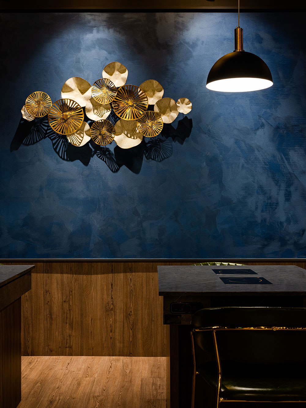 The furnishing scheme is planned with the idea of bestowing striking vision and happy memory to our customers. The texture of the Italy non-toxic blue paint wall, matches with the sparkling lighting, further assort with the black metal sheets; take the advantages of those elements just like fireworks in the night. The wood texture floor and the stone texture desktops highlight the white utensils and the steaming heat gently warm up the space.