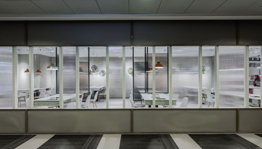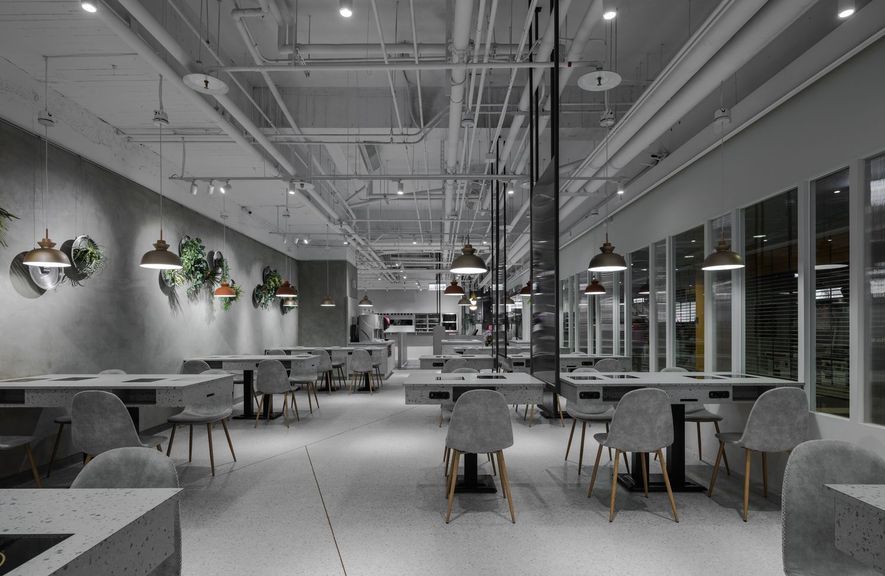 置身於南台灣人流與商店高度密集的車站大廳內,設計團隊將《奉食主義》定調為提供旅人迅速獲得身心舒緩的餐飲所在,因此選用爽利的灰白色系為基調,一則特出於其他五花八門的店面風格,另外更襯托出鍋物要角——肉的鮮色香氣。在一片白淨當中,天花板搭配採用挑空設計,展露出縱橫管線並整合內部迴路,其筆直線條對應寬闊的過道動線,顯示出場域有條不紊的理性氣息。