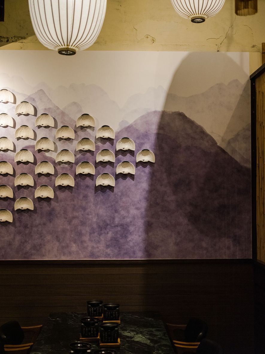 屋舍內部前段挑高,使足步由闊至窄有如探幽,錯落懸掛的長燈籠便成為引路燈,引人驅身向前同時目光環視——天幕由染色木材排闥構成斜屋頂,繞過竹片屏風,是精選日式風花磚拼貼而成的吧台,以及靜雅的墨綠、灰晶餐桌各就其位;而眼前所有風土物件的在場,更無聲圍塑老店方得醞釀的古味風華,將傳統美學與文化記憶在此召喚復甦。